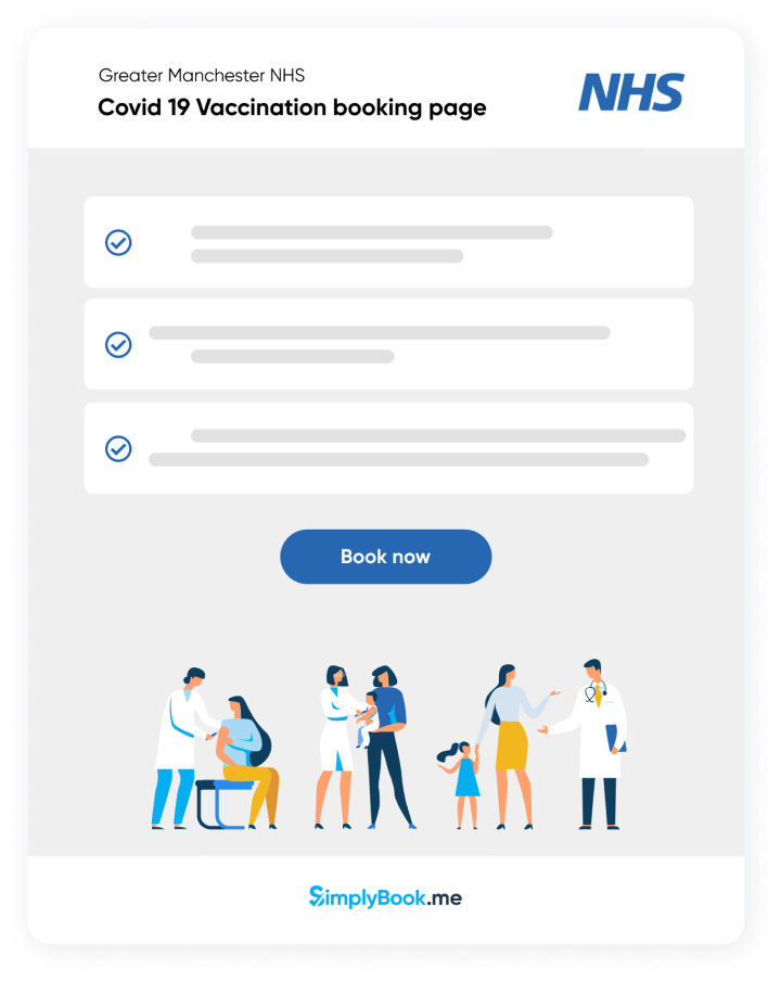 If your hospital, health laboratory, clinic or pharmacy is offering Covid-19 vaccinations, drop us an email to covid@simplybook.me or book an appointment and explain how you want to organize your vaccination process. To get you set up as quickly as possible, we will allocate an account manager so that your medical centre can accept patients for Covid-19 vaccination in a safe and organised manner. We are already servicing the NHS in 2 countries so we know what we are talking about.